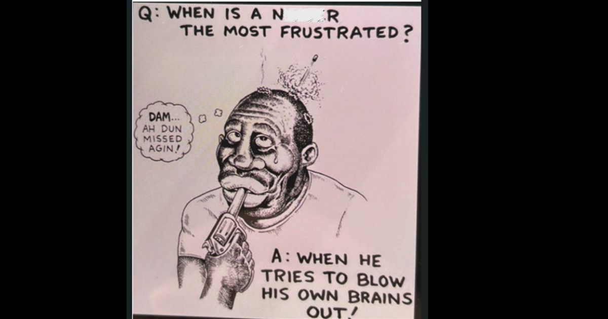 The message contained a caricature of a Black man with a large head, oversized lips, and a wide nose, according to the lawsuit. Above the image was the question: “WHEN IS A NIGGER MOST FRUSTRATED?” Below it was the answer: “WHEN HE TRIES TO BLOW HIS OWN BRAINS OUT!”